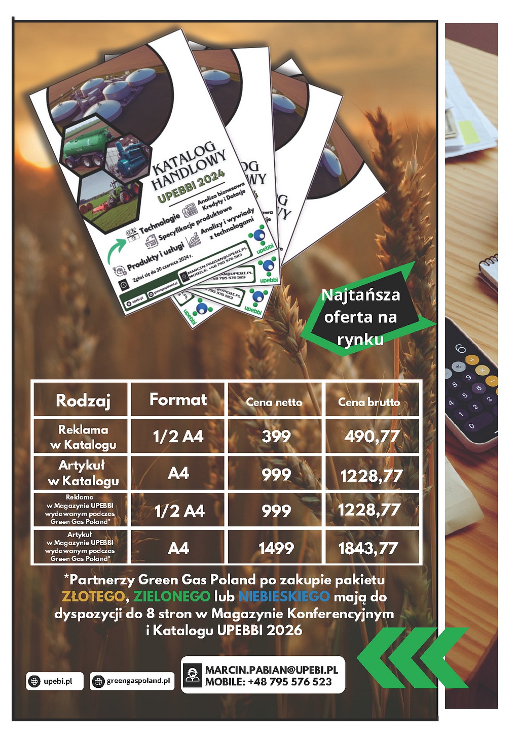 UPEBBI jako związek pracodawców przemysłu biogazowego i znawca problematyki chce uzupełnić rynek wydawniczy o Katalog handlowy UPEBBI. Najlepsze miejsce do zareklamowania swoich produktów już od 399 zł. Koszt publikacji na jednej stronie A4 to tylko 999 zł.
